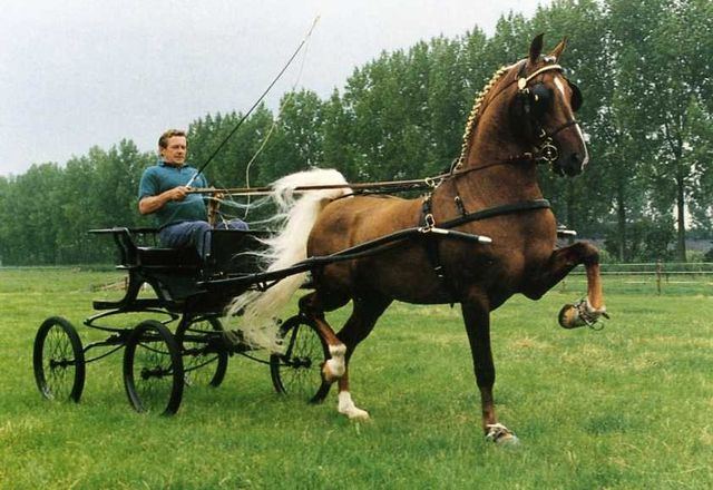 two American Saddlebred stallions to broaden the gene pool for their Dutch Carriage horses (known there as Tuigpaard). The goal was to improve the action of their gaits and to refine the horses. The experiment was eventually deemed a failure, as the resulting offspring were not fancy enough in their movement. But the experiment resulted in a number of nice horses who were successful in Grand Prix Dressage and even Grand Prix Jumping. Among those offspring was Kaareltje, son of Holland’s Golden Boy.
