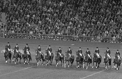 (Riders and horses in the black and white quadrille photo: Dr. Reiner Klimke on York, Liselott Linsenhoff on Piaff, Wolfgang Haug on Lorlot, Karin Schlüter on Liostro, Dr. Josef Neckermann on Venetia, Ilsebill Becher on Mitsouko, Willi Schultheis on Armagnac, Inge Theodorescu on Marzio, Walter Günther on Partisan, Gabriela Grillo on Honduras, Harry Boldt on Ariadne, Evi Pracht-Neckermann on Mazepa.)
