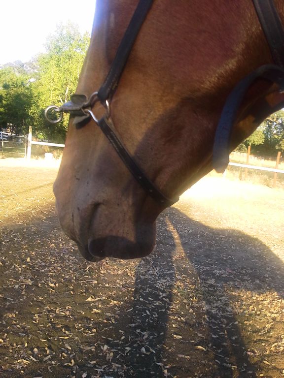 A little follow the leader – walking, turning, stopping, backing up and trotting. It was now time for another new twist. I’ve been working him in hand, walk and trot, and occasionally stepping a bit farther away from him. So, tonight, we made our first go at trotting a circle on the line. Walking on a turn, I asked him to trot, then let out the line and pointed the whip to direct him around. Piece of cake! No pulling, no stalling … just a lovely easy trot in a lovely circle! A nice way to redeem his bolting incident earlier in the weekend.