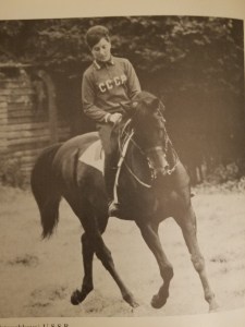 “A different attitude is revealed (left) with Pepel undergoing some early morning schooling. Elena Petouchkova, while forcing her horse to use himself by making a series of tight voltes, has dropped her curb rein completely. The effect is as though she were riding in a snaffle only. This is not unique, or even particularly important; but these two pictures effectively illustrate the difference between two totally opposed attitudes.”