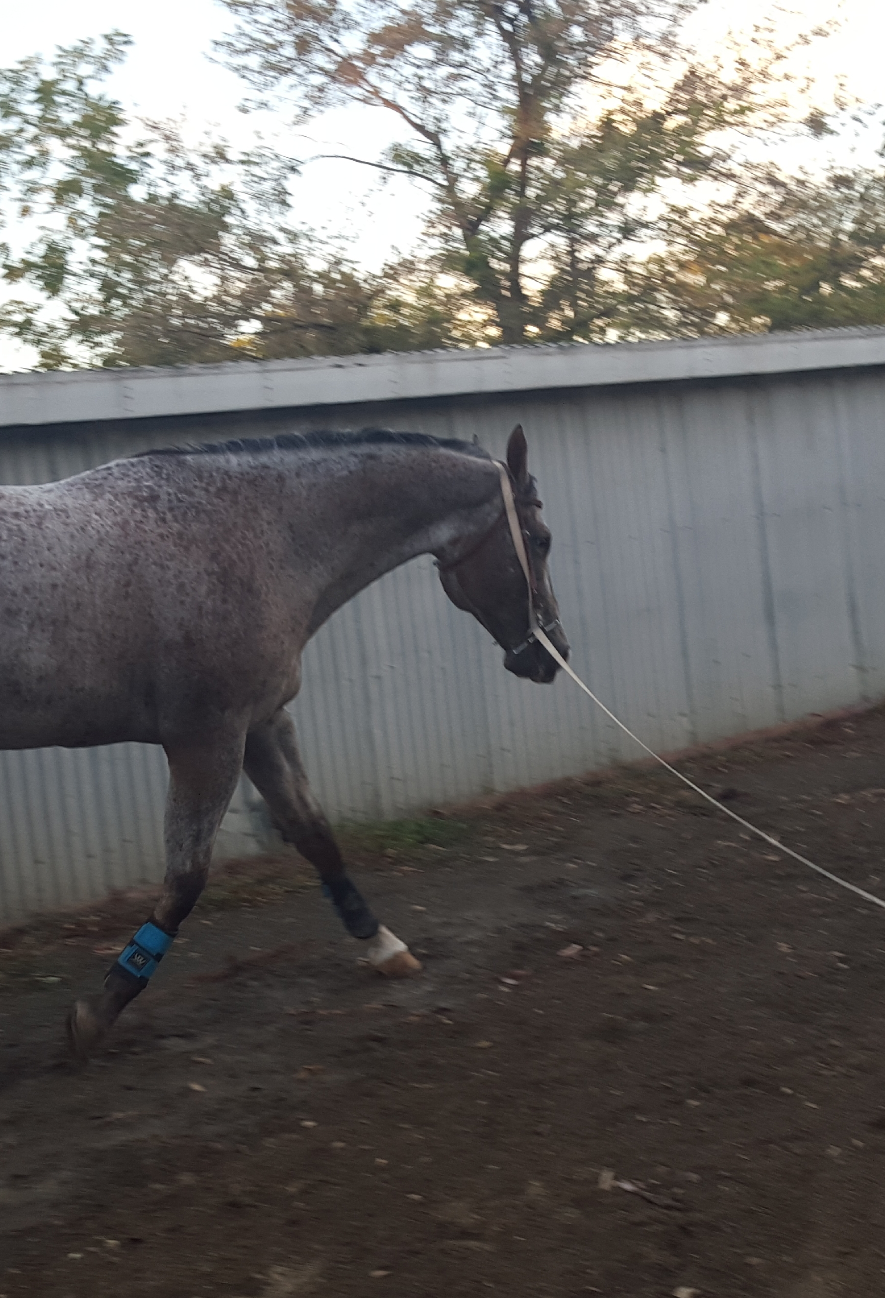So, it was time to incorporate a lungeing cavesson. I found a light Portugese model, and gave it a try. With the extra straps, sitting over the bridle, I really did finally have him. Several attempts to lose the whole thing were unsuccessful, and he soon gave it up. He has attempted to rub the whole thing off on his leg, but with no success. So, for the past three or four years, lungeing has been without incident And then …