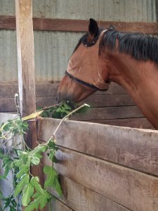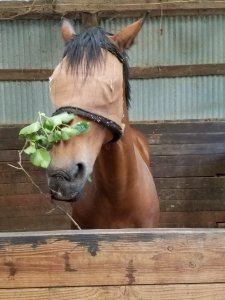 Even beyond consumption, branches offer amusement. Tugging, swinging, even throwing them over the partition to the other horse (yes, Noble and Coffee do that) have all been amusements involving branches. Aside from mental stimulation, which is great, it helps them replicate natural movements horses would experience in the wild.