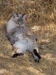 As I walk through the barn I don’t see the broken boards – I see the heads all asking for attention and a nice face rub or neck scratch. I see the lazy Frappuccino kitty sprawled on the dried grass, grooming his belly fur after a satisfying breakfast. I walk out to the back and lay Thorny to rest under the little rose bush, then look around at all the trees and shrubs we’ve planted – under many of them lies a being who enriched our lives on this property – and I feel at peace.