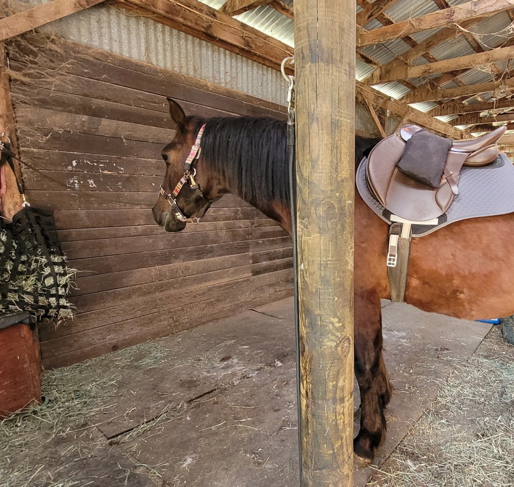 By this year, when we started back to work after Spring replaced Winter, things seemed to be going well. We were still mainly doing groundwork at that point, but I’d started tacking him up to aim toward riding again. It was about the third or fourth time I saddled him up that he stepped back from the hay net and stood looking disgruntled (for lack of a better word). His expression was a bit reminiscent of the early days – ears out and a bit blank. I worried a bit the first time this happened, so I kept an eye on him for any signs of physical discomfort. I didn’t notice anything unusual, other than this attitude at being tacked up. We kept it light and I hoped it was just a passing thing.